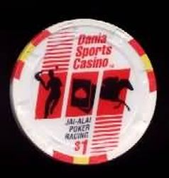 | 6. | Dania Jai Alai Dania FL, 1.00 White chip, 3 thin red/yellow/red inserts, Jai-Alai, Poker, Racing