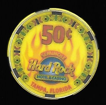 | 30. | Seminole Hard Rock Tampa FL, 0.50 Yellow chip, satin finish, colorful border, fire design, 3 dark blue/white rim inserts