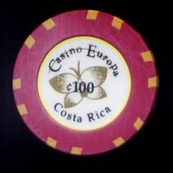 | 27. | Casino Europa Costa Rica, 1.00 Pink chip, 12 orange inserts, white circle inlay, 100c, butterfly