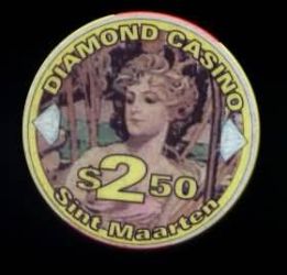 | 82. | Diamond Casino St. Maartin, 2.50 Yellow chip, red rim inserts, smooth finish, portrait of woman