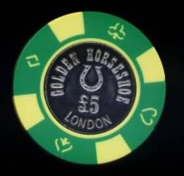 | 97. | Golden Horseshoe London England, 5.00 Yellow chip, green inserts w/4 suits inserts, coin center