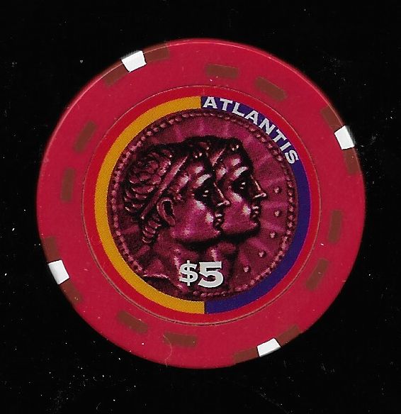 | 9. | Atlantis Paradise Island, 5.00 Red chip, 4 olive/white/olive inserts, circle inlay, statues