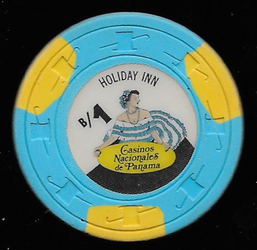 | 58. | Casinos Nacionales de Panama Panama, 1.00 Blue chip, 3 wide yellow inserts, H&C mold, dancing girl, El Panama