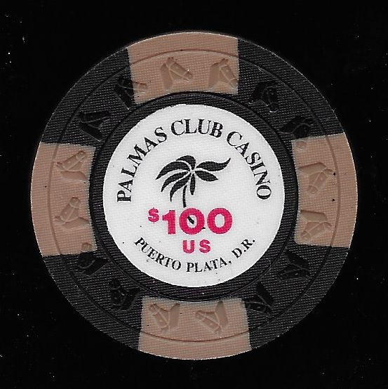| 130. | Palmas Club Casino Puerto Plata Dom Republic, 100.00 Black chip, 4 orange inserts, HHR mold, circle inlay