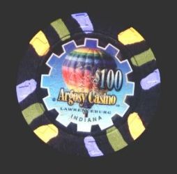 | 4. | Argosy Casino Lawrenceburg IN, 100.00 Black chip, H&C mold, 4 blue/brown/peach inserts, gear inlay