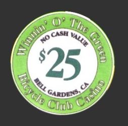 | 7. | Bicycle Club Bell Gardens CA, 25.00 Green chip, NCV, satin finish, leprechaun and clover design, 4 yellow inserts on rim