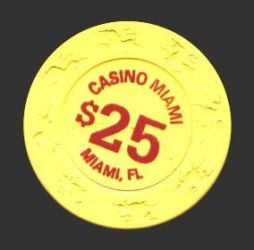 | 18. | Casino Miami Miami FL, 25.00 Yellow chip, unicorn mold, circle inlay, red hotstamped