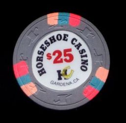 | 40. | Horseshoe Casino Gardenia CA, 25.00 Gray chip, 3 red/blue/peach inserts, circle inlay, H&C mold