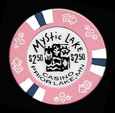 | 10. | Mystic Lake Casino Prior Lake MN, 2.50 Pink chip, dice/4 suits mold, 3 white/black/white inserts