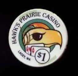 | 35. | Hawk's Prairie Casino Lacey WA, 1.00 White chip, satin finish, phone number on rim, hawk and blackjack design