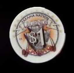 | 45. | Legends Casino Toppenish WA, 1.00 White chip, Yakama Nation, satin finish, arrowhead center design