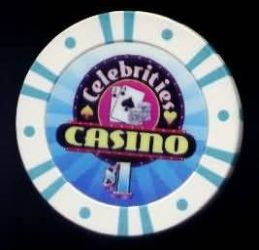 | 10. | Celebrity Bowl Kennewick WA, 1.00 White chip, 12 light blue inserts, 6 light blue dots, blackjack center design