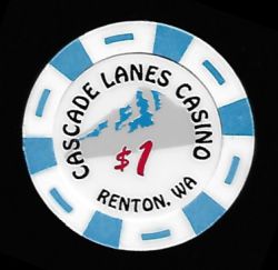 | 9. | Cascade Lanes Casino Renton WA, 1.00 White chip, blue inserts, circle inlay, mountain