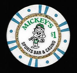 | 54. | Mickey's Sports Bar and Casino Port Angeles WA, 1.00 White chip, BudJones, blue inserts, gold ring inlay, leprechaun