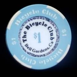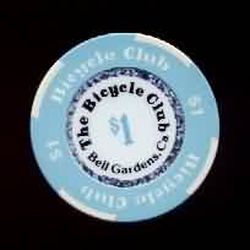 | 21. | Bicycle Club Bell Gardens CA, 1.00 Light blue chip, four narrow wide white inserts. holographic center ring