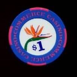 | 51. | Commerce Casino Commerce CA, 1.00 Blue chip, 4 narrow wide pink inserts, metal inlay