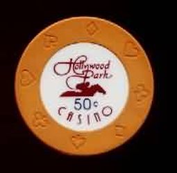| 80. | Hollywood Park Inglewood CA, 0.50 Orange chip, 4 suits mold, jockey on horse center design