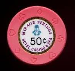 | 104. | Mirage Springs Desert Hot Springs CA, 0.50 Pink chip, 4 suits mold, ornate gold center circle