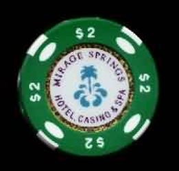 | 106. | Mirage Springs Desert Hot Springs CA, 2.00 Green chip, 4 white oval inserts, 4 white inserts, ornate gold center circle