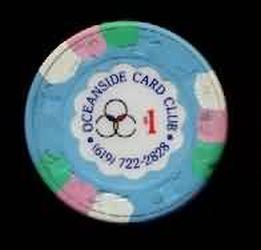 | 123. | Oceanside Card Club Oceanside CA, 1.00 Light blue chip, 3 white/pink/green inserts, H&C mold