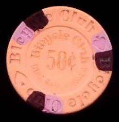 | 20. | Bicycle Club Bell Gardens CA, 0.50 Orange chip, house mold, 3 black inserts, hotstamped