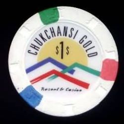 | 39. | Chukchansi Gold Coarsegold CA, 1.00 White chip, red / blue / brown inserts, circle inlay, sun over mountains
