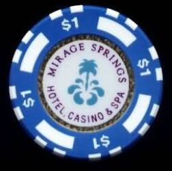 | 105. | Mirage Springs Desert Hot Springs CA, 1.00 Blue chip, 4 white horiz inserts, 16 white inserts, ornate gold center circle