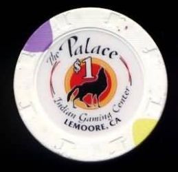 | 127. | Palace Casino Lemoore CA, 1.00 White chip, purple/yellow triangle inserts, H&C mold, circle inlay, coyote