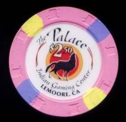 | 128. | Palace Casino Lemoore CA, 2.50 Pink chip, 2 blue / 2 yellow inserts, H&C mold, circle inlay, coyote
