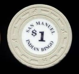 | 155. | San Manuel Indian Bingo Highland CA, 1.00 Tan chip, Dash-A mold, circle inlay
