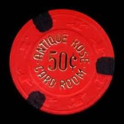 | 6. | Antique Rose Card Room Cameron Park CA, 0.50 Red chip, 3 navy inserts, hotstamped, circle inlay