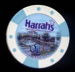 | 74. | Harrah's Rincon San Diego CA, 1.00 White chip, blue inserts, circle inlay, resort photo