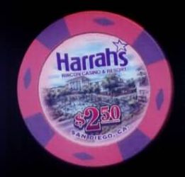 | 75. | Harrah's Rincon San Diego CA, 2.50 Pink chip, blue inserts, circle inlay, resort photo