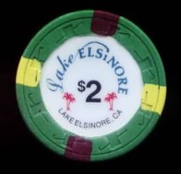 | 95. | Lake Elsinore Casino Lake Elsinore CA, 2.00 Green chip, 2 maroon / 2 yellow inserts, circle inlay
