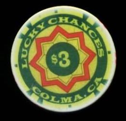 | 99. | Lucky Chances Colma CA, 3.00 Yellow chip, smooth finish, 8-pointed star design