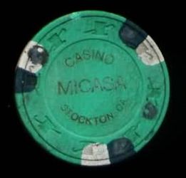| 103. | Mikasa Casino Stockton CA, 1.00 Green chip, 3 white/purple inserts, circle inlay, H&C mold, hotstamped