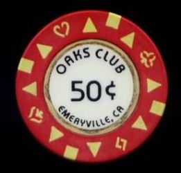 | 114. | Oaks Club Emeryville CA, 0.50 Maroon chip, yellow inserts, circle inlay