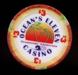 | 120. | Ocean's Eleven Oceanside CA, 3.00 Orange chip, H&C mold, orange center design with palm trees