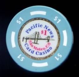 | 124. | Pacific News Cardroom San Mateo CA, 1.00 Aqua chip, white inserts, Bud Jones, bridge design