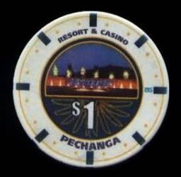 | 130. | Pechanga Casino Temecula CA, 1.00 White chip, smooth finish, navy inserts, resort photo