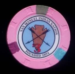 | 156. | San Manuel Indian Bingo Highland CA, 3.00 Pink chip, H&C mold, circle inlay
