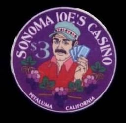 | 164. | Sonoma Joe's Casino Petaluma CA, 3.00 Purple chip, smooth finish, grapes, man holding 4 cards, North Bay Poker Classic