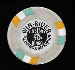 | 192. | Win River Casino Redding CA, 0.50 Beige chip, plain mold, circle inlay, 3 yellow/white/blue inserts