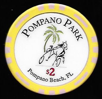 | 21. | Pompano Park Pompano Beach FL, 2.00 Yellow chip, pink inserts, circle inlay, harness horse