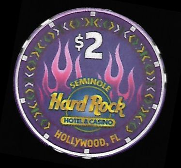| 28. | Seminole Hard Rock Hollywood FL, 2.00 Purple chip, satin finish, colorful border, fire design, 6 white rim inserts