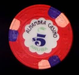 | 6. | Alhambra Casino Aruba, 5.00 Red chip, 3 blue/peach inserts, scalloped inlay