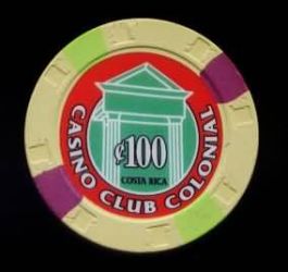 | 23. | Casino Club Colonial Costa Rica, 1.00 Tan chip, 2 purple / 2 green inserts, circle inlay, 100c, columns