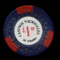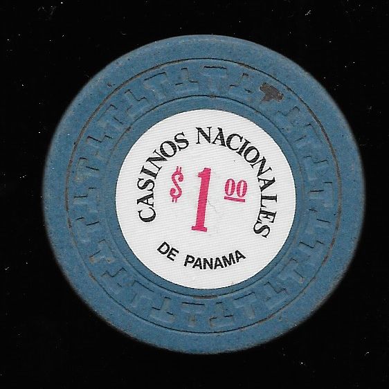 | 41. | Casinos Nacionales Panama, 1.00 Navy chip, T mold, circle inlay, large denom