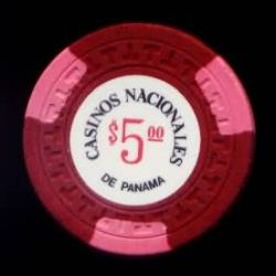 | 59. | Casinos Nacionales de Panama Panama, 5.00 Red chip, 3 wide black inserts, H&C mold, dancing girl, El Panama
