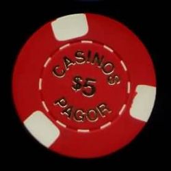 | 61. | Casinos Pagor Caribbean, 5.00 Dark red chip, 3 off-white inserts, circle inlay, hotstamped